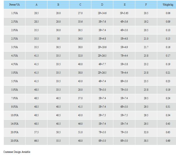 Power:0.5~30VA. Degree of Protection:IP00. Primary: 110/230V 50/60Hz. Secondary: 12/24VAC. Insulation class:Class Aã€Class B.