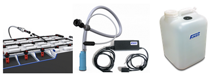 The Millennium Evo Battery Watering System simplifies the difficult task of watering industrial batteries. The system consists of automatic shut-off valves, interconnected with tubing, that replace the existing vent caps. A quick coupling allows the system to be connected to a water supply. Once connected, water flows into each cell until it reaches the correct level. A flow indicator built into the water supply tells the operator when filling has been completed. The entire process takes just 30 seconds per battery. (See Millennium Evo Brochure for more information)