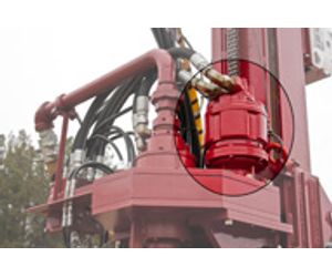 This particular DR150 track rig was fitted with an optional high torque motor on the tophead. This is a piston-type motor and is much more efficient than traditional hydraulic motors. It can also operate at higher pressures for more torque (turning force). On all drill rigs, not just ours, there can often be difficulty separating the drill rods (“un-threading”) when coming out of the hole after drilling. The extra torque eliminates that problem on the DR150.
