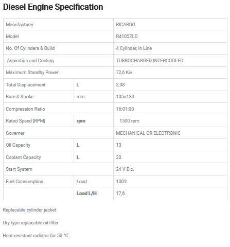- 4 Stroke, 1500 RPM, water cooled heavy duty diesel engine