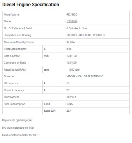 - 4 Stroke, 1500 RPM, water cooled heavy duty diesel engine