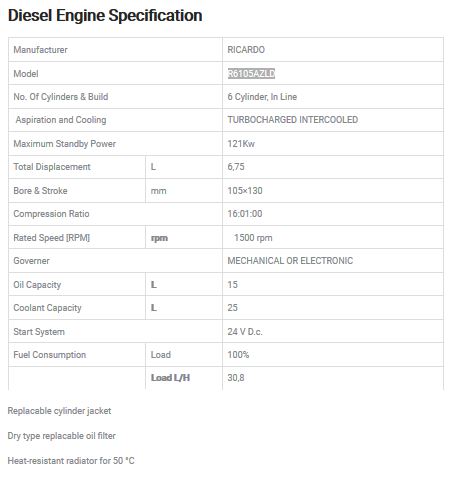 - 4 Stroke, 1500 RPM, water cooled heavy duty diesel engine