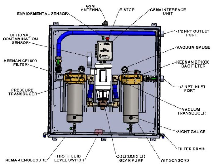 The KW 1500GSM was designed to meet the tough diesel fuel cleanliness requirements of todays engine manufacturers. This system utilizes an industrial grade SCADA monitoring system incorporated into our interface controller. The combination of our highly efficient filters and interface allows the polishing system to remove contaminants, sludge and water to meet SAE and ISO fuel requirements.