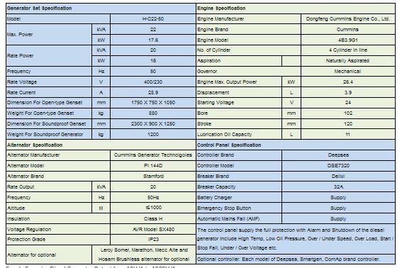 20kVA Cummins diesel generator powered by Cummins diesel engine model 4B3.9-G1, which produced by Dongfeng Cummins Engine Co., Ltd. under USA Cummins controlled factory in China. The engine with naturally aspirated better for longer life times. It has the advantage of high technology, durable, easy operation and maintenance. And the Cummins diesel engine is one of the most popular diesel engine for generator set, the users can easy get the spare parts in each country in the world.