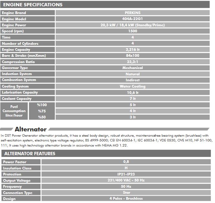 In DST Power Generator engine products; High performance, low fuel consumption, mechanical or electronic governor depending on the type, Oil, air, fuel filters are interchangeable, using high technology engine brands in accordance with ISO 3046, ISO 8528, BS 5514, DIN 6271 standards.