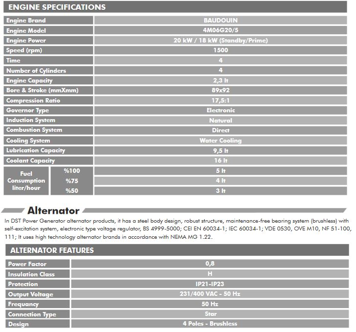 In DST Power Generator engine products; High performance, low fuel consumption, mechanical or electronic governor depending on the type, Oil, air, fuel filters are interchangeable, using high technology engine brands in accordance with ISO 3046, ISO 8528, BS 5514, DIN 6271 standards.
