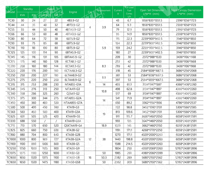 TC series diesel generator set with Cummins enginePower range within 30kVA ~ 1650kVA•Cummins engine with advaced design, reliable performance and durable operation•Alloy Steel crankshaft and connecting rod, high durability•High combustion effciency and low fuel consumption, working continuously•PT pump injection technology, safe and reliable•Optimized design of anti-vibration system, accurate pressure-boost and low speed cooling fan reducing noise effectively•Generator excitation system making generator set recover under any sudden loading with frequency falling, ensuring power supplying reliably.