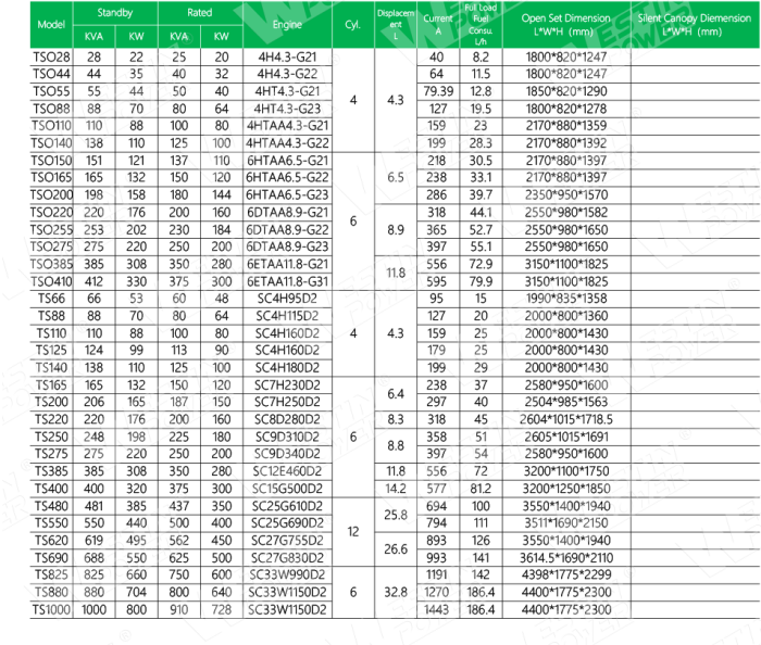 TS series diesel generator sets with SDEC enginePower range within 28KVA ~ 1000KVA•Using the high quality (SDEC) engine of Shanghai Diesel Engine Co., Ltd.•Through joint design and development with internationally renowned companies such as AVL in Austria and RICARDO in Britain, SDEC has launched series of engines including R, H, D, E, G and W;The engine adopts modular design, standard design of accessories, high rigidity and high strength design of cylinder body, four-valve structure, sensitive and precise electronic governor;The engine has strong power, strong environmental adaptability, starting normally at low temperature.