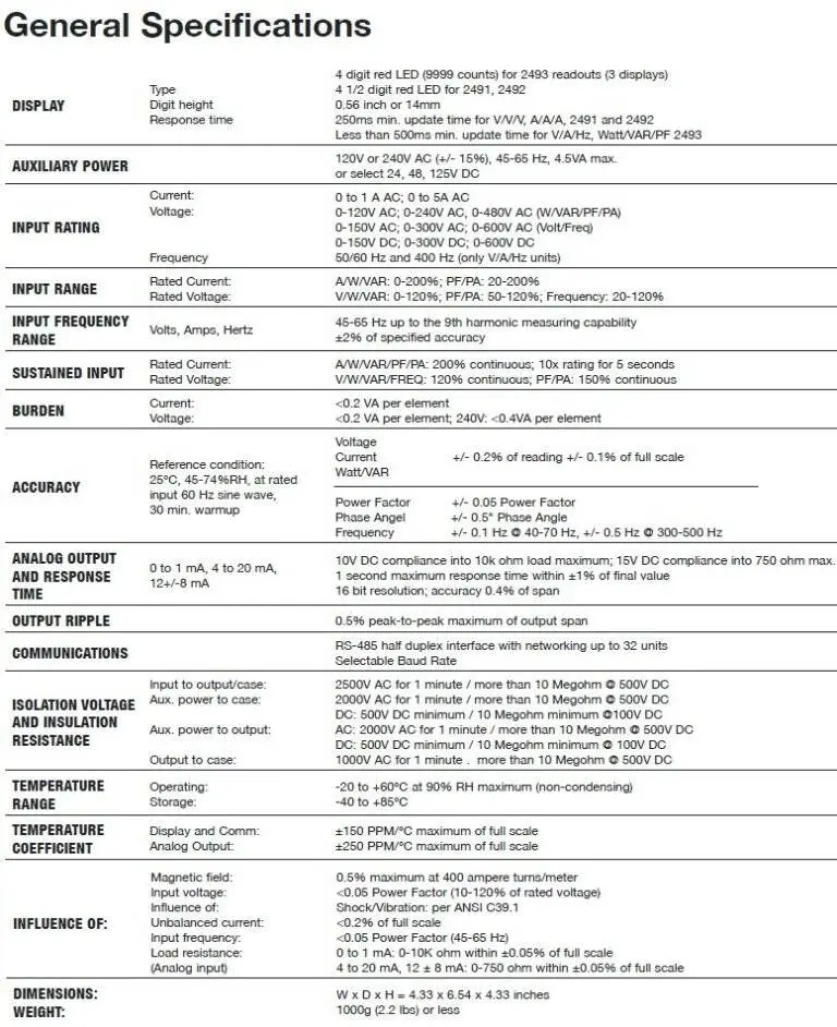 2493 Power Series Plus Digital Switchboard Meters: Model 2493 includes AC Amperes, AC Voltage, and Frequency measuring capabilities, as well as flexible options for Input Rating, Frequency, Analog output and Communication options.