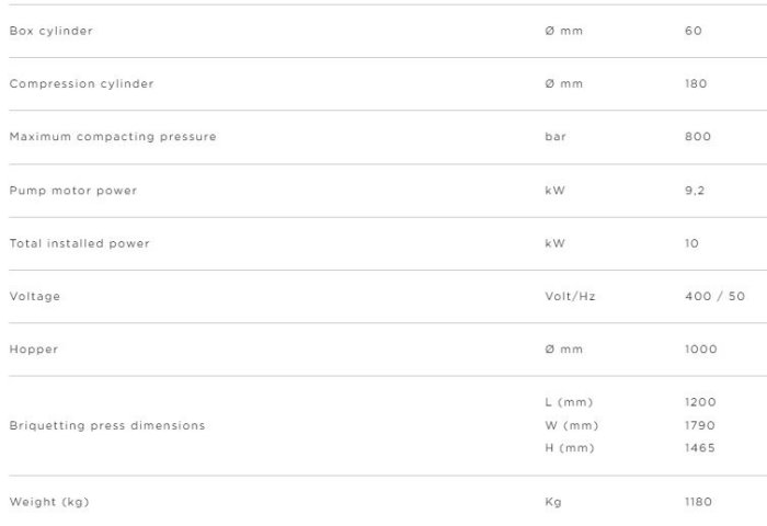 The compressing unit has been projected with excellent build quality and reliability criteria. It is composed of a hydraulic cylinder with Parker seals, whose position is detected by a mechanical limit switch), and a piston rod to compress the material in a sleeve inside the compression chamber and shape the briquette.