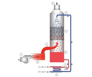 Air supplied by a blower (1) is raised in temperature by the heat source (2). The hot gas enters the direct contact exchanger inlet (3) and travels upward through a high efficiency packed bed (4) with over 30 sq. ft./cu. ft. of active heat transfer surface area. Cool water is introduced at the top of the unit through a liquid distributor (5) where it comes into intimate counter current contact with the hot gas in the packed bed as it travels downward. Sensible heat transfer between the colder water and hot gas occurs resulting in rapid heat up of the water. The heated water drains into the sump section (6) and is pumped (7) through a plate and frame or shell and tube heat exchanger (8) to reheat return heat transfer liquid in a complete closed loop cycle. Cleaned reduced temperature gas now saturated with water vapor exits out of the top of the unit (9).