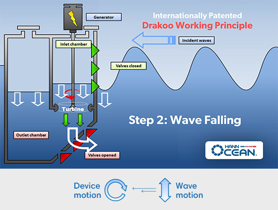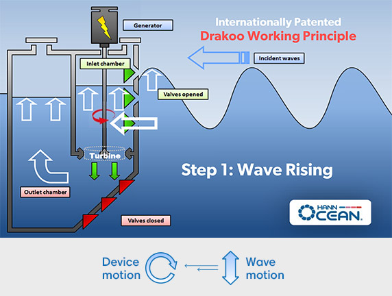Drakoo works by transforming ocean waves into a stream of continuous water flow which drives a hydro-turbine generator.