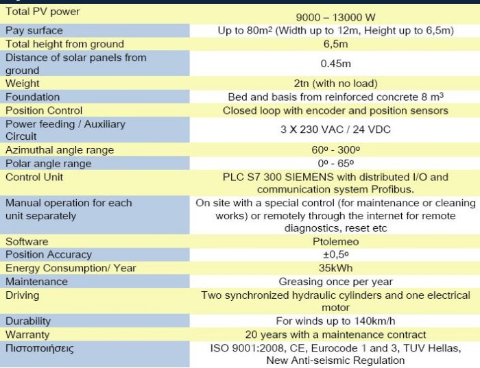 The motion mechanism of the system is based on two axes. It follows automatically the sun`s azimuthal and polar movement maximizing solar radiation incidence and thus the electricity production by the photovoltaic panels. The system is driven by the most reliable way: Software using astronomical algorithm is employed to compute the precise position of the sun at any given moment as a function of time, date and latitude. In this way the system cannot be misled by weather conditions (clouds etc) or other interfering factors (artificial lighting etc.). During cloudy weather, it automatically sets itself at horizontal position in order to receive the maximum of the diffuse radiation, minimizing at the same time energy consumption.