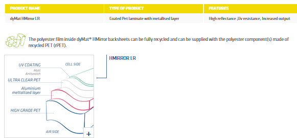 Coveme has developed a highly reflective laminate developed for the retrofitting of PV modules . dyMat® HMirror LR is installed between the module rows and reflects the sun light back onto the module, thus increasing the average energy output of the installation.