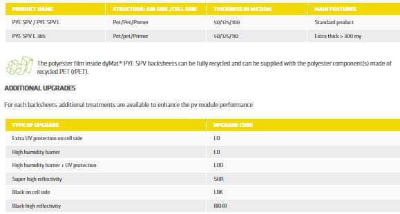 - dyMat® PYE SPV-SPV L products are UL registered and TÜV RHEINLAND , TÜV SUD and JET certified.