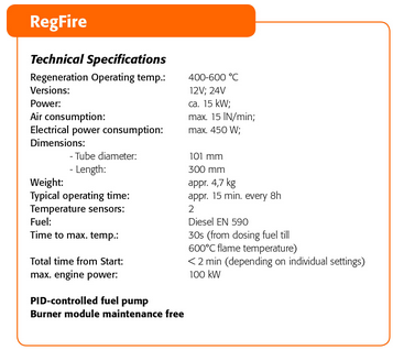In many applications with difficult operating conditions the exhaust gas temperatures are not sufficient to run exhaust aftertreatment systems like Diesel Particulate Filters (DPF) or Selective Catalytic Reduction (SCR) effectively. A simple burner is often capable to increase the exhaust temperature and make the aftertreatment systems work in the effective temperature range. DYNTEST RegFire has been developed for these applications. The retrofit diesel burner is designed for the regeneration of DPF under idling conditions. Also SCR systems can be kept at temperature during idle mode. The thermal power of the RegFire® module is about 15 kW. It is suitable for engines up to approximately 100 kW.