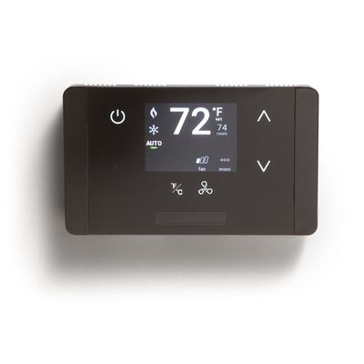 - Traditional thermostat buttons replaced with icons on glass