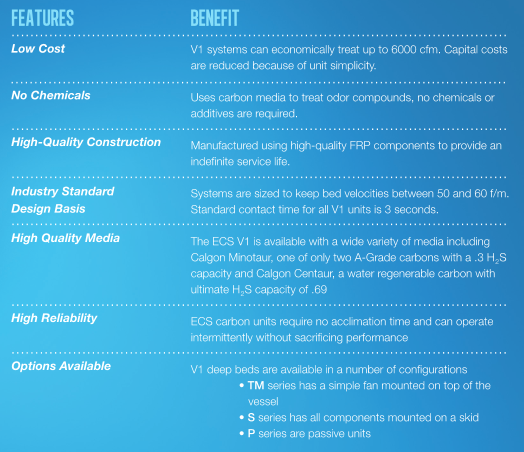 The V1 is a low cost, highly effective system for removing H2S and other compounds from municipal wastewater applications. These systems can utilize a wide variety of adsorbent media. ECS carbon systems provide reliable performance, low installation costs and require little to no maintenance under normal oneration conditions.