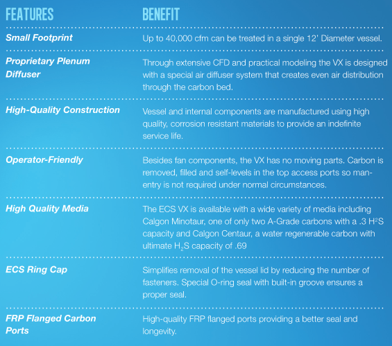 - Small foot-print and the ability to treat up to 40,000 cfm in a single 12` Diameter vessel