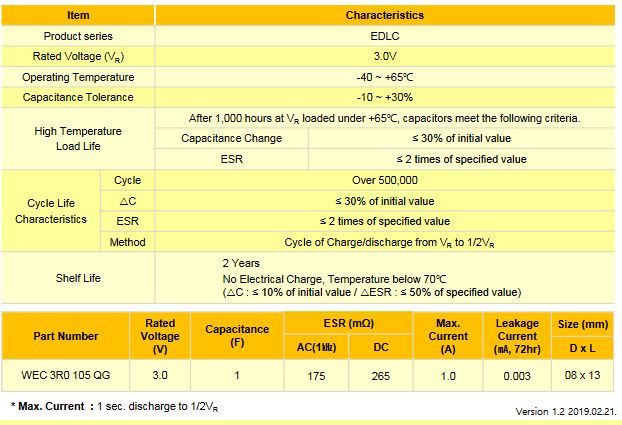 EDLC (Electric Double Layer Capacitor). High Power Density. Over 500,000 cycle life (semi-permanent). Higher energy density compared with 2.7V caps. RoHS compliant. Long-term reliability improved at high temperature and humidity.