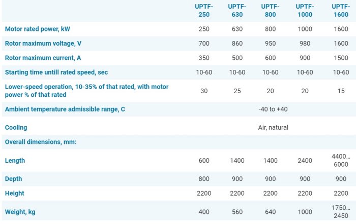 UPTF equipment is intended for contact-free smooth starting of asynchronous motors with a phase-wound rotor. The basic application of UPTF is the starting of high-voltage asynchronous motors with a power of 100-1600 kW for: Transportation belt conveyers in mining plants of different profiles, fuel transportation belt conveyers in heating power stations, where the transportation of granular products over remote distances is required, slow start of different lifting devices, slow start of mills and crushers, slow start of pumps with asynchronous motors with a phase rotor.