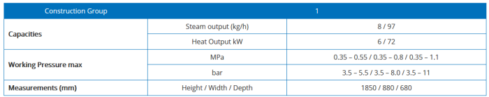 The CERTUSS E6M –E72M Electric steam generator range, offers you the customer a wide choice of steam capacity, with 14 units available from 8 kg/h (6 kW) to 97 kg/h (72 kW) and operating pressures from 3.5 bar G to 11 bar G.