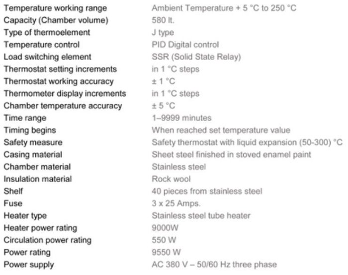 Chamber dimensions (w x h x d) : 42 x 80 x 43 cm, Overall dimensions (wxhxd) : 120 x 225 x 60cm, Net weight : 245 kg, Gross weight : 285 kg.