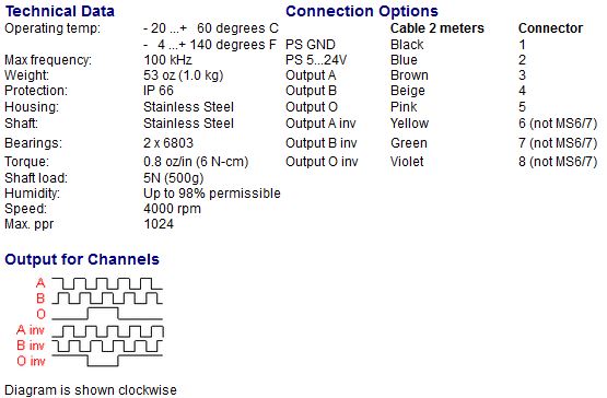 Slide encoder onto shaft. To keep encoder from rotating: have a pin to prevent rotation in one of the mounting holes, or a bracket bolted onto the mounting holes, or simply tie wrap the cable. Whatever is done, ensure there is a bit of play between encoder and mounting arrangement to prevent bearing damage. Hook up the encoder with the connections as described. Make sure power supply meets specifications.