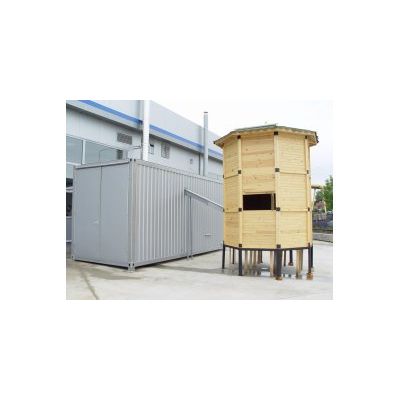 Part of the energy cabin is used as biomass fuel warehouse – wood pellets or wood shavings (chips). The warehouse volume is usually calculated to ensure minimum fuel reserves for 5 days. The flue gases generated from the biomass boiler burning process are led over the building through isolated chimney.