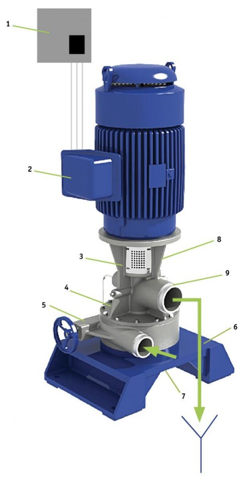 The LPD turbine generator uses low-pressure brine hydraulic energy to produce electrical energy. The LPD turbine generator Energy Recovery Device uses brine hydraulic energy to drive a standard induction motor that acts as a generator to produce electrical energy. Integrated into the unit is a regenerative VFD that regulates the LPD to achieve brine flow and pressure as required for the desired membrane operating conditions while extracting the maximum amount of electrical energy available from the brine stream. The vertically mount motor eliminates a large baseplate. The shaft alignment is assured by highly accurate machine fits of the components.