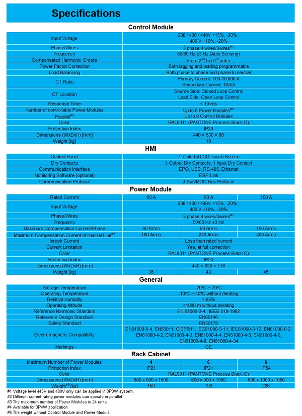 3 Level IGBT Technology for Top Performances. Space-saving High Power Density Design. Modular Design and Flexible Application. Easy Hot-scalable and Hot-swappable Power modules for Installation and Maintenance. Compensate up to 51st Harmonics Orders. Power Factor Correction for Both Leading and Lagging Power Factor. Correct Unbalance Three Phase Utility. Can Work in Closed or Open Loop. Different Current Rating Units Can Operate in Parallel. Advanced Operations Interface: 7”Color LCD Touch Screen. Display Voltage/Current Waveform, Parameter and Harmonic Spectrum.