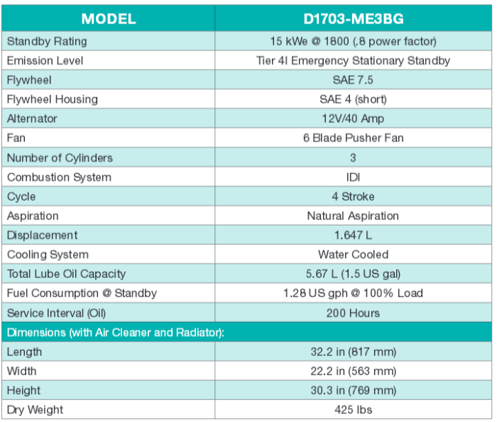 Don’t underestimate the compact package of the D1703. This Kubota BG engine is a powerhouse with a standby rating of 15 kWe @ 1800 rpm and a 12V/40 amp alternator. With its prized combination of output, effi ciency and always-ready reliability, this engine is a smart choice for any emergency stationary standby generator OEM.