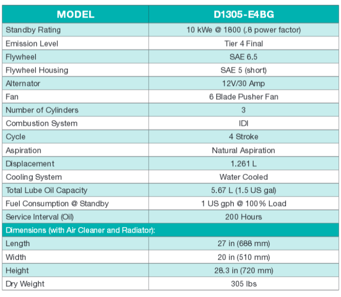 Don’t underestimate the compact package of the D1305. This Kubota BG engine is a powerhouse with a standby rating of 10kWe @ 1800 rpm and a 12V/30 amp alternator. With its prized combination of output, effi ciency and always-ready reliability, this engine is a smart choice for any emergency stationary standby generator OEM.