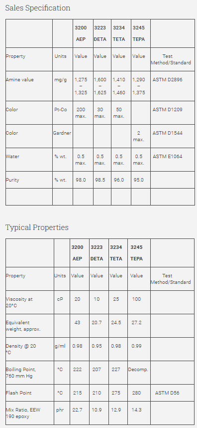 EPIKURE Curing Agents 3200, 3223, 3234, and 3245 are unmodified aliphatic amines. They are used in a variety of applications including epoxy curing agents. Due to their tendency to form complexes with atmospheric carbon dioxide, particularly in humid conditions, they are most often formulated, adducted or otherwise reacted to inhibit amine blush.