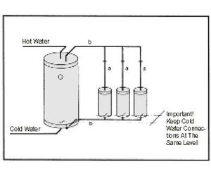 The pipework inter-connecting the heat exchanger(s) and the cylinder is carried out by the installer up to a maximum distance of 3m. The heat exchanger and storage cylinder cold water inlet connections should be at the same height above floor level. All cold and hot water inter-connecting pipe work should be sized in accordance with dimension (b) in the data table. The riser tubes (a) included in the Eureka supply may be internally nickel plated as an extra cost option.