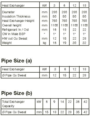 Heat exchangers are electro-plated, ribbed copper tube. The exchanger is mounted onto a flange plate and assembled into an internally vitreous enamelled steel barrel complete with wall mounting bracket. Protection against heat loss is afforded by a high quality 50mm thick polyurethane insulation with wipe-clean PVC casing. The refrigerant connections are identified with adhesive colour bands: