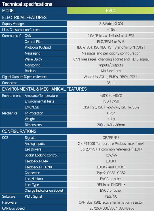 Supply Voltage 3-36Vdc (KL30) Max. Consumption Current ~10A Communicat° CAN 2.0A/B (max. 1Mbds) or J1939 Control Pilot PLC/PWM or WIFI Protocols (Output) IEC 61851, ISO/IEC 15118 and/or DIN 70121 Messaging Message and periodicity configuration Wake Up by CAN messages, charging socket and KL15 signal Monitoring Inputs/Outputs Backup Malfunctions Digital Outputs (Open collector) Wake Up VCUs, BMSs, OBCs, PDUs Connector 35pts.