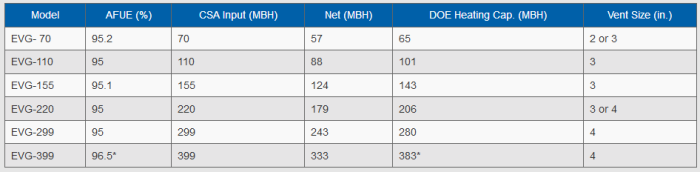 Stainless Steel Fire Tube Heat Exchanger with non-metallic base. Floor Standing Boiler with optional wall mount kit. Available in 6 Sizes: 70, 110, 155, 220, 299, 399 MBH. Modulating Condensing Boiler . 95% AFUE (70-299); 96.5% Combustion Efficiency (399). 4 Pump/Auxiliary Outputs (Example: 1 boiler loop pump +3 zone pumps). Up to 8 Multiple Boiler Control with lead/lag rotation. Modbus® to BMS connectivity. Each input can be assigned to a priority (Up to 3 Priorities). Multiple Inputs can be assigned one priority (Zone Based Control). All Lag Boiler Inputs and Output can be used. 0-10 Volt Input (modulation or set point). Configurable Auxiliary Input/Output System. Boiler Circulator Included (ECM version with 70-155).