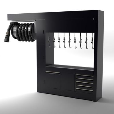 Multi-service portal for the distribution of energy and to house up to 9 fluid reels, equipped with a drip tray and a panel for the service passage. it can be fully integrated with technical cabinets and with hose reels to extract the darwin model exhaust gas. specific configurations are available on request.
