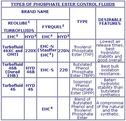 Originally the raw materials used included cresylic acids derived from coal tar and coking operations. While still synthetic fluids, they have become known as "natural" phosphate esters. Examples include tricresyl or trixylenyl phosphate and GLCC (was FMC) fluids such as Reolube Turbofluid 32XGT and 46XC. Those made from phenolics derived from other processes are known as "synthetic phosphate esters. Examples of these are isopropylphenyl diphenyl phosphate and tertiary butylphenyl phenyl phosphate. The corresponding FMC fluids are Reolube Turbofluid 46 and Hyd 701 and 32B GT and 46B. The products with GT are for gas turbine driven equipment while the others are for hydraulic and/or electrohydraulic control applications. The different fluids are required because the various fluids have pros and cons. However, they all share the characteristics of being fire resistant and having high flash and fire points as well as high autoignition temperatures and low heats of combustion. Plus, having good oxidative stability and EP wear characteristics.