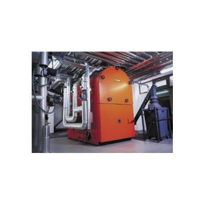The stoker feeds the fully refractory lined combustion chamber from underneath. A hermetically insulated Three-pass flame tube boiler sits on top of the firebox.