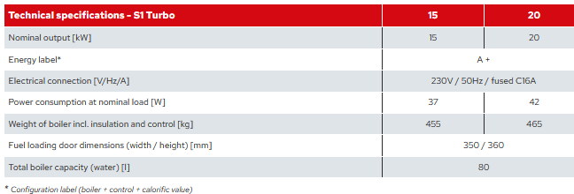The S1 Turbo (15 – 20 kW) combines all the features of a state-of-the-art biomass combustion system. The speed-regulated induced draught fan ensures constant high quality combustion, and the carbonisation gas extraction system prevents flue gas from escaping, even when topping up. The new S1 Turbo stands out for its high efficiency and long refilling intervals, as well as its low emissions and low energy consumption. The new air duct concept in Froling’s S1 Turbo firewood boiler automatically regulates the heating, primary and secondary air with a single actuator. Thanks to the special air ducts for pre-heating, the fuel loading chamber door can be closed very soon after lighting. Heating with firewood can be that convenient!