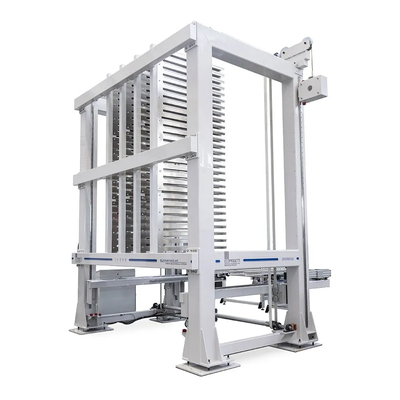 The BUFFER FIFO 30 is a high-capacity First In, First Out (FIFO) storage system for solar modules. It features an Automatic Axis Pick & Place system and a long edge forward configuration. With a stacking capacity of 30 modules (optionally expandable to 50), it is ideal for managing high production volumes. The system includes adjustable timing for automated panel discharge and offers an auto discharge function. An automatic drawer allows for individual panel discharge when needed, providing flexibility in handling and storage.