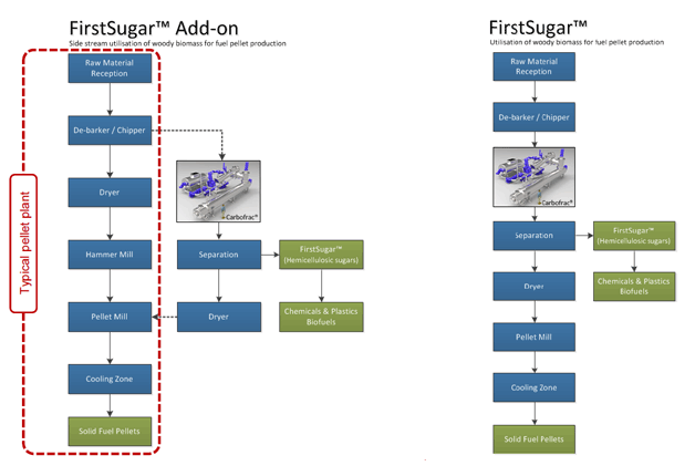 The Carbofrac® system enables a number of different production value chains using a variety of biomasses as input. Two main approaches are currently being pursued: as a bolt-on concept to existing plants, where a side stream is utilised for FirstSugar™ production or as a complete process step for a pellet plant, where all the woody biomass is converted into improved pellets and the sugar is extracted.
