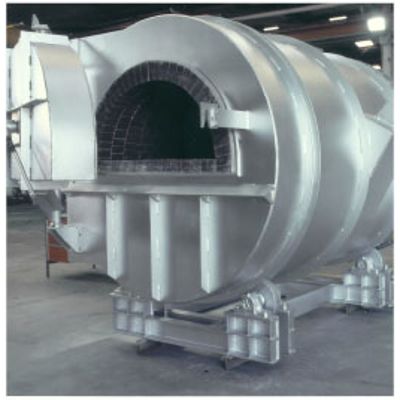 The furnace comprises a refractory lined cylinder, swing aside charge door, rear mounted burner and flue, rotary cradle and roller bearings, stationary floor mounted support, fixed fume hood and control cabinet.
