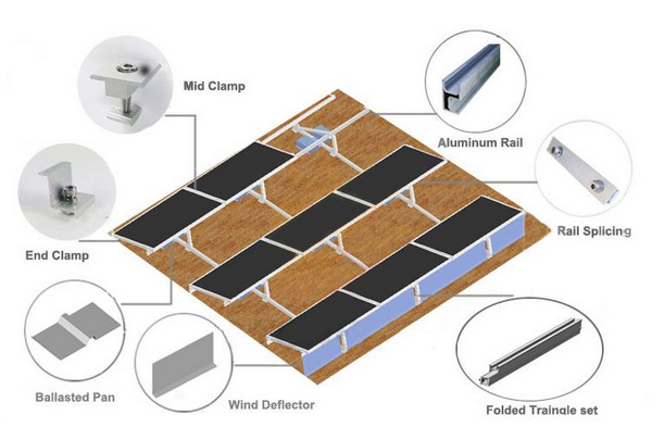 Location Flat roof. Mounting Types ballasted block. Arrangement Horizontal. Design Standard JIS C8955/ AS/NZS1170 / DIN1055 / IBC2009. System`Material Al6005-T5 Aluminum Alloy (Oxidized Surface). Parts`Material Al6005-T5 Aluminum Alloy (Oxidized Surface). Fastener Material SUS304. Quality Guarantee 12.