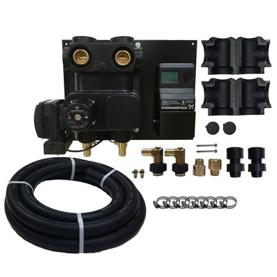 Flo-Link variable speed panel mount flow centers includes all of the controls, sensors, and fittings necessary for connecting to the ground loop (1-1/4” PE fusion) and the heat pump (1″ FPT, 1″ swivel union, or double O-ring female union). Flo-Link variable speed flow center kits are required when you wish to have a pressurized variable speed pumping solution with a geothermal heat pump that does not include variable speed controls. If your heat pump has built-in variable speed controls, you can use a standard FL flow center with variable speed pump(s).