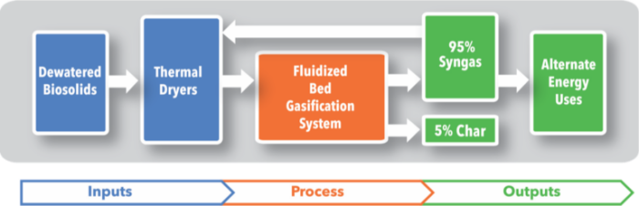 Fluidized bed gasification is a process that converts carbon-containing waste material into a synthetic fuel gas, along with a very small amount of inert char. Waste feedstock is fed into the gasifier and a controlled amount of oxygen is introduced. Once necessary temperatures are achieved and maintained, a thermo-chemical process converts the biomass into a combustible syngas primarily composed of carbon monoxide, hydrogen and methane. That sustainable fuel can be deployed in a commercial dryer to remove moisture from biosolids. The system can cleanly reduce volume by as much as 95%.