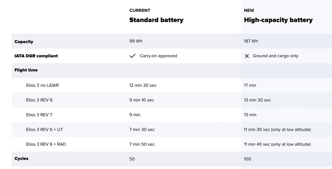 The high-capacity battery works with all Elios 3 payload configurations, including Rev 6 base LiDAR, UT, Surveying, Gas sensor and RAD?delivering extended flight time across the full range of industrial applications supported by the Elios 3. Note that flight behaviors may differ based on the payload and operating environment when using the high-capacity battery—especially with the UT and RAD payloads. For further details, please consult the technical specifications.