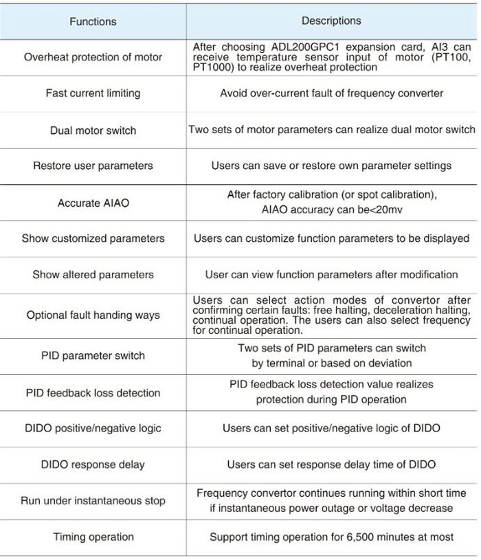 General functions and descriptions of ADL200G series frequency inverter: Abundant voltage classes: support three voltage classes, namely single-phase 220V, three-phase 220V and three-phase 380V. Abundant control mode: apart from vector control of velocity sensor, sensorless vector control and V/F control, support V/F separation control. Abundant field bus: support Modbus-RTU and CANIink field bus. Abundant encoder types: support difference encoder, open collector encoder and rotary trans-former, etc. Brand-new sensorless vector control algorithm Brand-new SVC creates better low-velocity stability, stronger low-frequency load capacity, and supports torque control of SVC. Powerful background software: uploading, downloading parameters, real-time oscilloscope can be realized on background software.